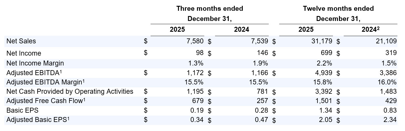 Smurfit Westrock plc’s performance for the three months and twelve months ended December 31, 2025 and 2024 (in millions, except margins and per share data):